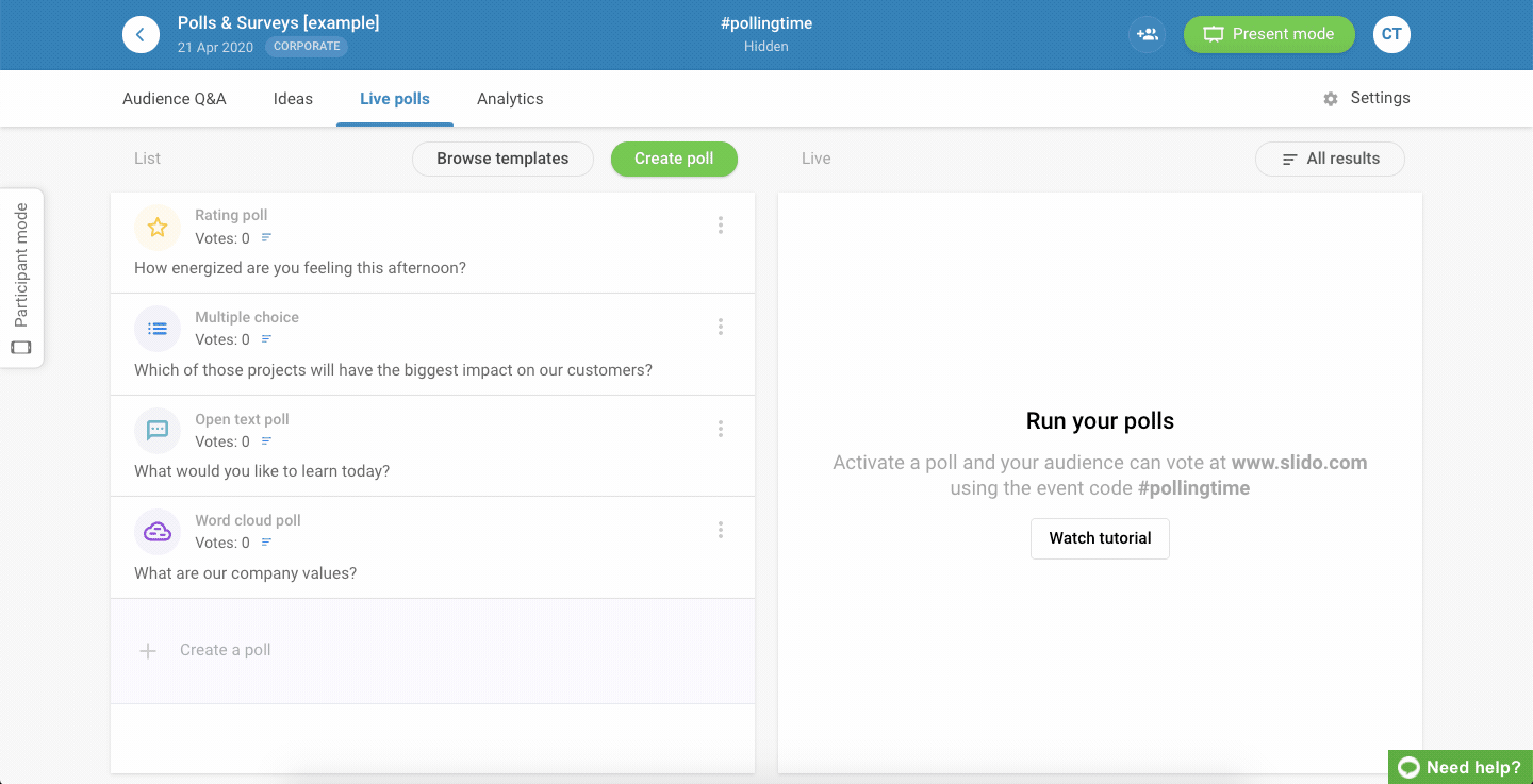 Create polls, word clouds q&a and more and everyone to contribute using their smartphones. Full of features and customizations. Create your online polls in minutes! For this poll, we'd like to find the best time for a revision meeting. Create a free poll that is responsive on all devices, including mobiles and tablets.